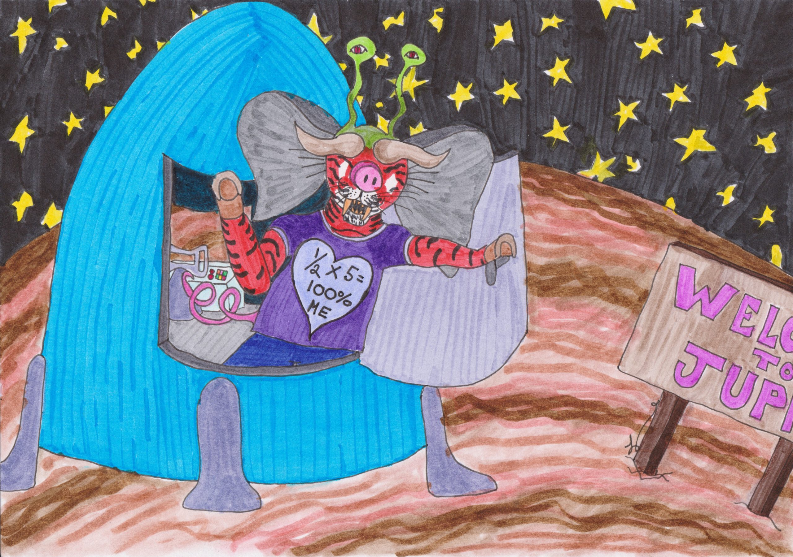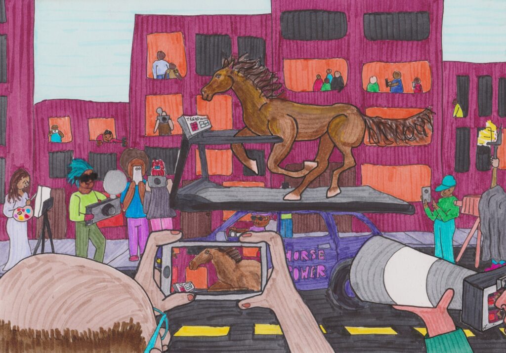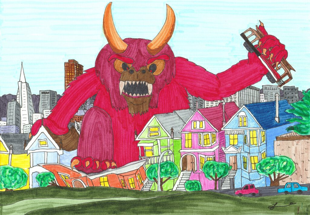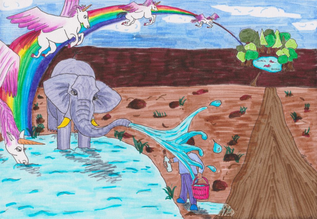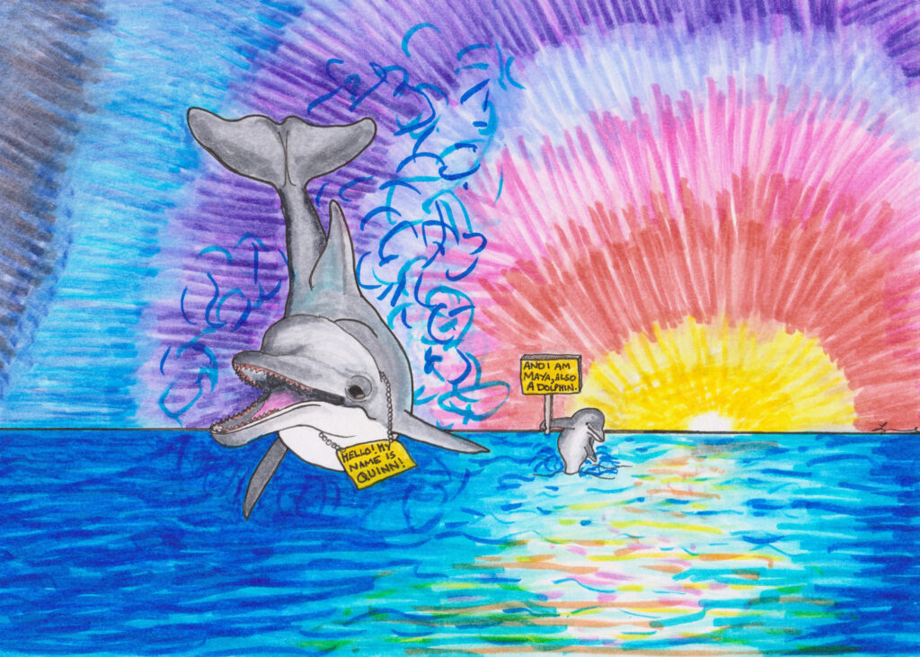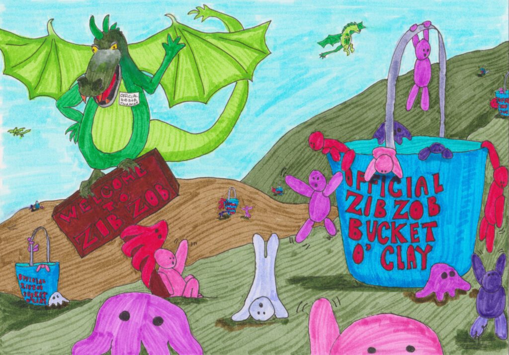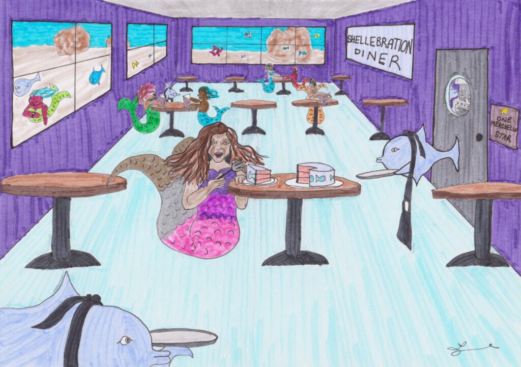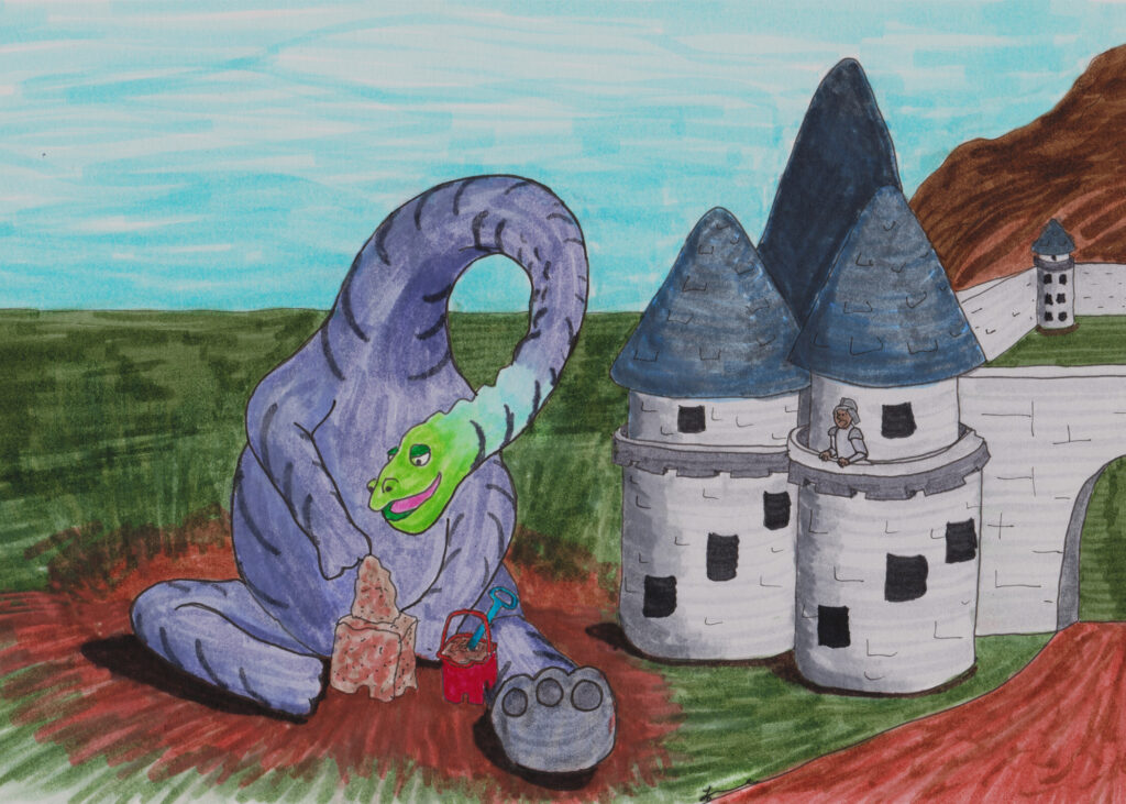 Natalie, almost 9: “A very stretchy person surrounded by fruit that has swirls on it”Simon, 4: “A robot house. Not a house for robots. It’s a house that folds up into a robot.”Anders, 8: “A picture of a picture inside the picture.”Benjamin, 11: “A dog with a very long tongue chasing a squirrel with a very big tail in the middle of a corn field.”Jaya, 8: “A microscopic gymnastics in a space ship looking at the enormous earth.”Mae, 11: “A brownie drinking ice tea in an English castle.”Alex, almost 5: “A pink, purple, gold, and silver mermaid eating cake at a mermaid restaurant.”Harry, 6: “A half alien half bull half pig half elephant half tiger in a space ship on Jupiter”Walter, 10: “A flute playing a violin that’s playing a trumpet in an outer space orchestra.”Harry, 6: “A manta ray peeking out of a cave with a crown and a necklace with a star on the necklace and the cave is surrounded by other cow nose rays holding spears coiled up in its wings.”Jack, 2: “Lynne making a dragon.”Gretchen, Age 7: “Quinn the dolphin jumping out of the water, with her friend Maya also a dolphin.”Jamie, almost-3: “A dinosaur playing outside a castle.”Anders, 8: “A scary, demon-like two-headed dragon breathing fire from one head and lightening from the other.”Astra, 2: “A guitar that can see.”Avi, age 6: “A rainbow car spinning fast in the mud that looks like a helicopter.”Levi, age 8: “A tan llama eating grass in the forest, with a sneaky fox, sneaky coyotes and wolves during the day.”Aashi, age 6: “There is a unicorn and an elephant at a watering hole. The unicorn is drinking water. Very thirsty. The elephant is taking water in its snout and shooting it at Aashima who is collecting water from the watering hole with a bucket and water bottle. The unicorn has wings so she flew to a forest where there was a lake with ducks. Unicorn flew away. Elephant is shooting at Aashi in her face and she has to try to get water before it goes down.”Friday, age 8: “Three Christmas gnomes playing in the snow in the yard of their house. One is making a snow angel and the other two are in a snow ball fight.”Rafi, age 11-months: “Duck!”Ava, age 8: “Three fashion models who are best friends backstage hugging”Marlowe, age 6: “A big, mean monster stomping around San Francisco.”Fiona, age 7: “A cheetah eating a plate of chicken nuggets at a restaurant.”Beau, age 6: “Be a snake.”Thea, age 10: “A concert on a yacht that’s being over-run by walking sharks and there is a bunch of seagulls in the air.”Gavin, age 8: “Two monkeys in a tree. Drinking banana smoothies and I (Gavin) am doing backflips in the forest with them.”Roman, age 10: “A character from Minecraft chopping down a tree.”Roslyn, age 8: “A kitty at a tea shop with a dog wearing a t-shirt that says ‘this is my tea shop.’ Also, there’s no people in the world, only animals. And then raccoons are around them dancing in the tea shop background.”Jake, age 6: “A horse galloping on a car surrounded by people taking photos.”Gunnar, age 12: “Queen Victoria at a tea party and Queen Elizabeth the First comes down as a ghost and steals their tea.”Ronan, age 9: “I want to see two monkeys with a catapult and I want some big giant bananas sitting in the part where the rocks go and I want the setting to be in a field but I want me standing in the background putting my hands on my hips and going, “what’s going on here?!” and the bananas are screaming.”Bennett, age 6: “A country called Zib Zob and in Zib Zob there’s a flying dragon and clay sculptures what can move.”